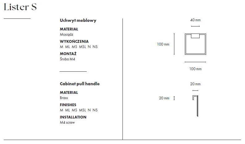 Seria LISTER to kolekcja uchwytów listwowych montowanych na skraju frontu, przeznaczona do mebli wszelkiego rodzaju – od zabudów meblowych typu garderoby, poprzez kuchnie, po meble wolno stojące. Prostota i funkcjonalność w połączeniu z niezwykłą dbałością o detal powodują, że seria LISTER to synonim elegancji i cichego luksusu. Polerowany mosiądz lub